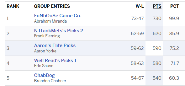 We got a little football action during the World Series’ off day, and I’m happy to say that I started the week 1-0 with my picks, but these standings remained the same because everyone picked Baltimore to crush Miami.