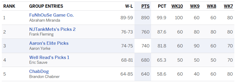 I was terrible last week, but so was everyone else except Abe, who tightened his stranglehold on the ChabDog picks contest by being sharp when everyone else was being square. Abe had New England when the rest of us had Tampa and New Orleans when the rest of us had Carolina. The only good pick I made was Houston, and that was still a loser after the Texans’ miracle comeback! It took a fluke touchdown at the end to get Houston to cover the spread. At least I finished strong with big wins by the Chargers and Eagles.